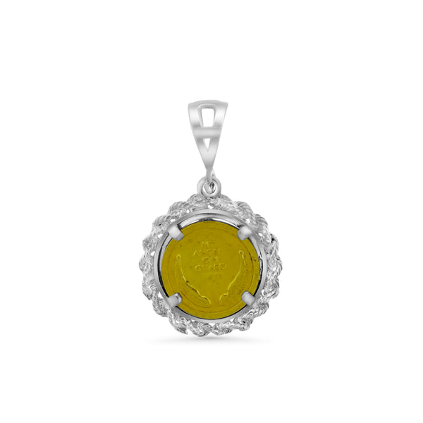 Round pendant with a gold vermeil coin that has an angel in the center and the words "Guardian Angel" at the top and bottom. The back of the coin has an image of a pair of wings and the words "My Angel on Guard." There is a rope design around the pendant and a triangle bale at the top.