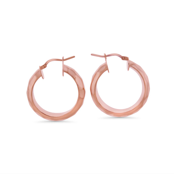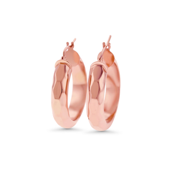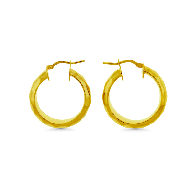 Hoop style earrings with a hammered design on the outside. The interior has a flat design. The hoops have a latch style closure.